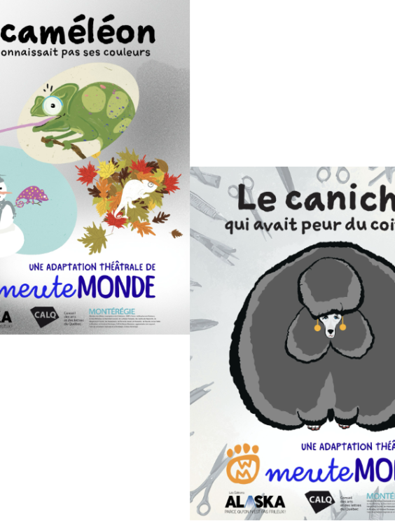 L’œuvre, créée en collaboration avec les éditions Alaska, est une adaptation théâtrale de deux livres pour enfants écrits et édités au Québec: Le Caméléon qui ne connaissait pas ses couleurs et Le Caniche qui avait peur du coiffeur. Cette adaptation rassemble marionnettes, musique, chant, théâtre et danse dans une scénographie centrée sur l’utilisation des lumières UV (Blacklight Theatre), pour créer un univers visuel captivant et magique!